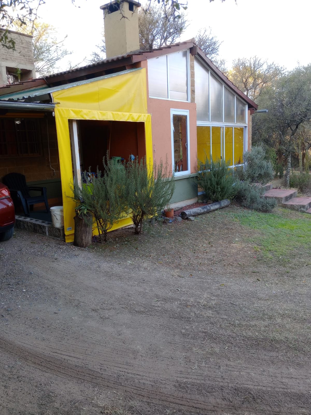 b) Casa con una amplia galería, cocina amoblada, comedor, un baño y un dormitorio con placar empotrado.